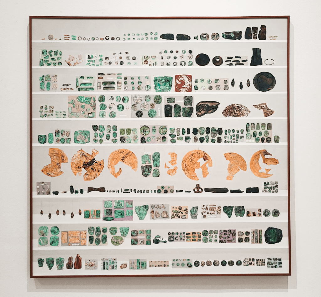 DA: This is all a thoughtful analysis, and I think you hit an important spot here: there’s a difference between what the works are actually doing, the artist’s intentions, and the political implications of the exhibition. When you analyze 615 Offerings and Precipitations for an Arid Landscape, there is an implicit desire for action and restitution in the works and exhibitions that are focused on processes of looting, the origin of collections, and the politics of institutions on acquiring cultural heritage. By reading the quotation you bring into attention, and watching Porras-Kim’s remarks on the on the exhibition (available on the museum’s website), it is clear that the work lives exactly where the artist wants it to be: a sort of evocation that creates the opportunity for a series of aesthetic and conceptual operations, well rooted into artistic and museum canons: cultivating mold, shaping dust, capturing humidity, creating compositions by scrambling information, or adding elements together, etc. While it is important that the artist contributes to the dissemination of the complicated histories behind museum collections, there seems to be a certain complacency with the current state of things.