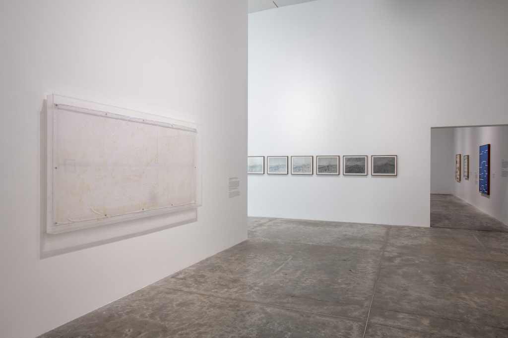 Las últimas dos obras de la primera sala, Dejar la institución por un proceso de cremación es más sencillo que como el resultado de una política de cesión (2021), y Un escape terminal del lugar que nos ata (2021), ofrecen un giro adicional: en ambas se realiza un gesto artístico (una huella y una pintura, respectivamente) donde la artista asume la voz de personas cuyos restos funerarios han sido integrados a colecciones museales. En el primer caso, Porras-Kim realiza una huella de la mano izquierda, en representación de los restos humanos que sobrevivieron parcialmente a la destrucción del Museo Nacional de Rio de Janeiro, tras el incendio de 2018; en el segundo, la artista diseña una especie de proceso de adivinación, al utilizar la técnica de tinta suspendida en agua (luego transferida al papel) para imaginar el emplazamiento geográfico donde deberían descansar los restos humanos de la colección del Museo Nacional de Gwanju. En ambos casos, Porras-Kim ha generado contacto escrito con las instituciones para sugerir sus gestos artísticos como alternativas simbólicas de restitución, acción que le suma al entramado de actores y actantes del complejo ecosistema invocado por los debates de la restitución del patrimonio cultural. Las obras precipitan la pregunta sobre la posición desde donde el arte participa del debate patrimonial. ¿Qué rol juega y a quién representa la voz artística que “reta” a la voz institucional? Esta pregunta es fundamental, si pensamos que el problema de la restitución es también una pugna epistemológica y un debate sobre la representación cultural y política de pueblos y comunidades sometidos a la violencia colonial.