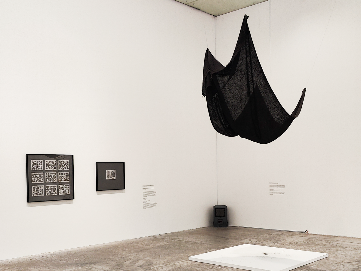 El resto de la sala está ocupado por un grupo de obras que nos ubican en la tradición de la crítica institucional, movimiento artístico que tiene sus orígenes en la década de 1960. Por un lado encontramos Fragmento del ala Michael C. Rockefeller del MET 1982-2021 (2022), un pequeño cubo de polvo elaborado a partir de aglomerar fragmentos de suciedad descartados del reciento mencionado. Este gesto parece opuesto y complementario al Condesation Cube, realizado por el artista alemán Hans Haacke, entre 1963 y 65. Luego, De una instancia de caducidad surge una muestra perenne (2022) presenta un amplio lienzo al que le han sido agregadas esporas de moho del Museo Británico, prosperando hasta formar una composición visual que recuerda algunas pinturas del expresionismo abstracto norteamericano. Esta obra, al igual que la anterior, reflexiona sobre los límites de la infraestructura que custodia el patrimonio saqueado o extraído, aplicando presión sobre el argumento de que las instituciones museales occidentales son las mejores custodias de los artefactos históricos. Estos gestos siguen también la línea experimental de artistas como Dieter Roth, que también en los años 1960s experimentaba con el moho, en contexto con la decadencia material de la obra artística. Al observar ambas obras, es inevitable pensar en cómo estos experimentos históricos persisten en el presente y qué dimensiones diferentes o adicionales aparecen (o no) a partir de su re-visita en el arte contemporáneo.