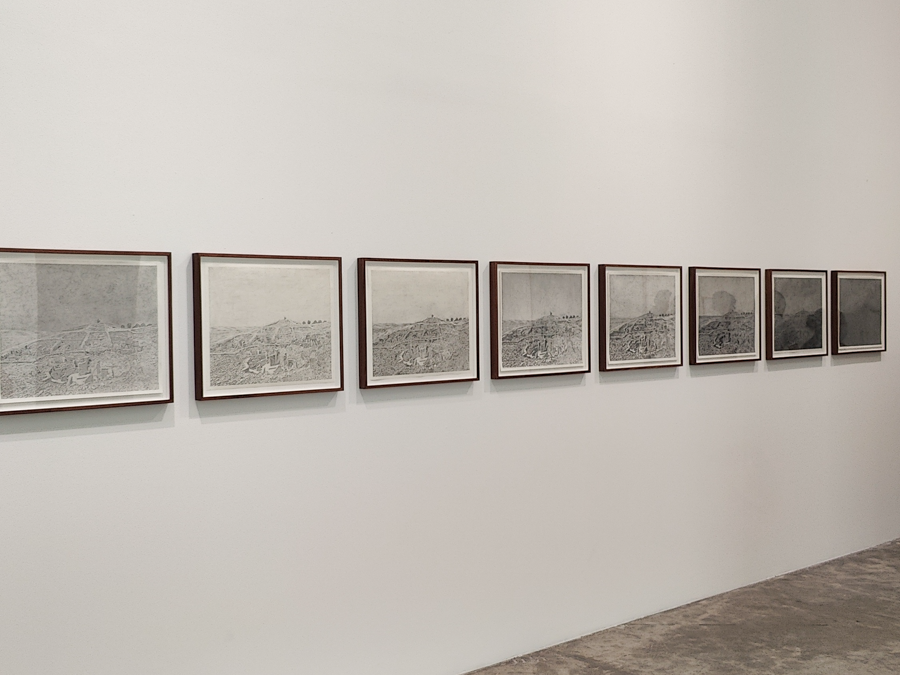 Continuando por la primera sala encontramos Asíntota hacia un horizonte ambiguo (2021), una serie de dibujos que retratan el templo neolítico de Göbekli Tepe en Turquía, en diferentes horas del día. El título y la didáctica museal nos hacen saber que el interés de la artista en el sitio tiene que ver con la indeterminación de la arqueología con respecto al uso y origen de la construcción. Esta ambigüedad ha sido señalada acertadamente por Porras-Kim en otras ocasiones. Por ejemplo, su instalación sin título para la bienal de artistas de Los Ángeles Made in LA 2016, hace uso de una serie de objetos del Museo Fowler de la Universidad de California, los cuales carecen de metadatos. En ausencia de esta información, los objetos son inclasificables y pierden su valor en el contexto científico y museal. En este caso, la artista escoge una estrategia de persistencia sobre la imagen para remarcar su interés sobre este tipo de historias, que delatan la fragilidad de los sistemas de clasificación de colecciones museales y científicas [3].
