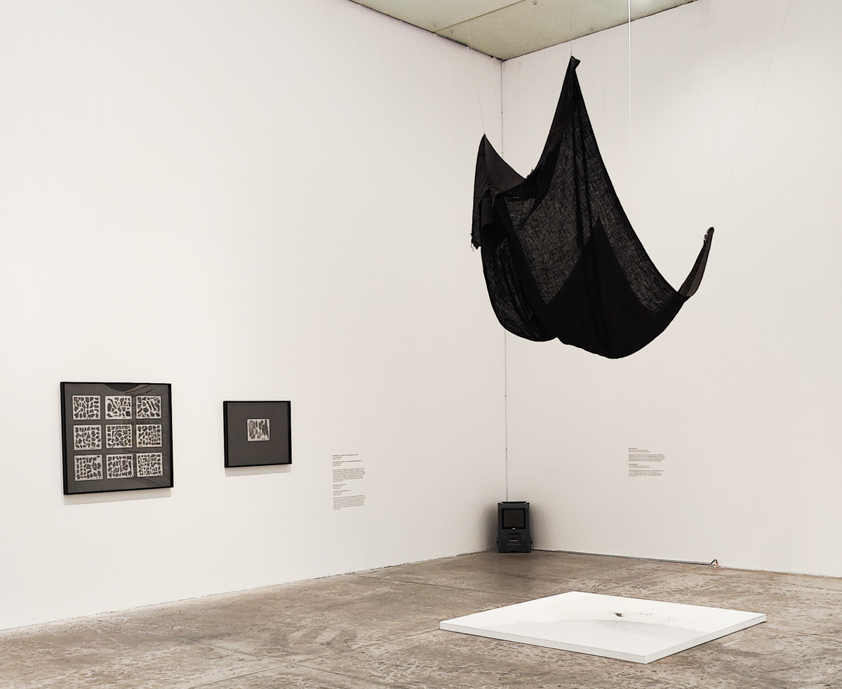 El resto de la sala está ocupado por un grupo de obras que nos ubican en la tradición de la crítica institucional, movimiento artístico que tiene sus orígenes en la década de 1960. Por un lado encontramos Fragmento del ala Michael C. Rockefeller del MET 1982-2021 (2022), un pequeño cubo de polvo elaborado a partir de aglomerar fragmentos de suciedad descartados del reciento mencionado. Este gesto parece opuesto y complementario al Condesation Cube, realizado por el artista alemán Hans Haacke, entre 1963 y 65. Luego, De una instancia de caducidad surge una muestra perenne (2022) presenta un amplio lienzo al que le han sido agregadas esporas de moho del Museo Británico, prosperando hasta formar una composición visual que recuerda algunas pinturas del expresionismo abstracto norteamericano. Esta obra, al igual que la anterior, reflexiona sobre los límites de la infraestructura que custodia el patrimonio saqueado o extraído, aplicando presión sobre el argumento de que las instituciones museales occidentales son las mejores custodias de los artefactos históricos. Estos gestos siguen también la línea experimental de artistas como Dieter Roth, que también en los años 1960s experimentaba con el moho, en contexto con la decadencia material de la obra artística. Al observar ambas obras, es inevitable pensar en cómo estos experimentos históricos persisten en el presente y qué dimensiones diferentes o adicionales aparecen (o no) a partir de su re-visita en el arte contemporáneo.