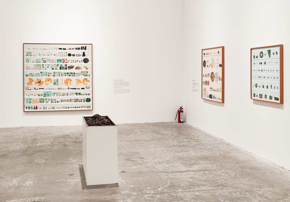 Una de las consecuencias paradójicas de la representación artística es su notable efecto persuasivo: cuando vemos los objetos reunidos de forma simbólica en el dibujo, estos parecen estar en su espacio legítimo. La representación pictórica contribuye a la estabilización del artefacto cultural como un objeto capturado, perteneciente al orden de la antropología y al display museal. Y digo consecuencias paradójicas, pues es precisamente la pregunta por la extracción y la trayectoria del objeto lo que motiva muchas de las obras de Entre lapsos de historias. Las representaciones en dibujo de las múltiples ofrendas extraídas del cenote tienen la estructura visual del gabinete museal, lo que parece confirmar cierta sospecha de la artista e investigadora Claudia Rodriguez Ponga-Linares sobre la primacía cultural de positivismo modernista: “si el arte quiere legitimarse como una forma respetable de conocimiento, debe renunciar explícitamente a cualquier vínculo con lo sobrenatural mágico y, además, reivindicar constantemente su filiación con la Ciencia” [4]. Esto significa, que si bien la investigación artística tiene curiosidad por la trayectoria del objeto, se termina por reconocer que su lugar en el presente debe ser, de todas maneras, la colección museal, sometida a la categorización de la ciencia y las reglas institucionales. Las preguntas finales que surgen de esta reflexión están localizadas en esta especie de trayectoria circular del objeto de investigación (que termina en el museo) y la obra que le interpela (que a pesar de presentarse como un gesto crítico hacia la institución, termina también dentro de ella, igualmente celebrado). Y aún más, si bien estas obras de Porras-Kim han sido presentadas en museos internacionales, ¿qué dimensión cobran cuando llegan de regreso a una institución mexicana? ¿Qué lecturas adicionales ofrece esta curaduría que compila una gran cantidad de gestos en apariencia contramuseales de la artista?