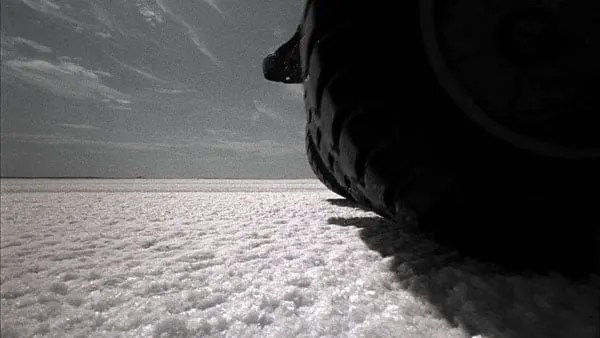 This reflection inevitably made me think of Iñigo Manglano-Ovalle’s work Juggernaut (2008), a single-channel video that equally challenges our perception. In this intense audiovisual piece, our gaze softly drifts over a white landscape, accompanied by the rumble of an indistinct machine. The pristine white field and scattered clouds invite us to think we’re looking through an airplane’s side window. Then, our mental image is suddenly ruptured by a massive wheel that crosses our line of vision: we have been transported from the air down to a salt flat, in a flickering movement that challenges our perception. It feels like coming to our senses, a metaphoric landing that reminds us of our tiny scale against the vastness of everything else.